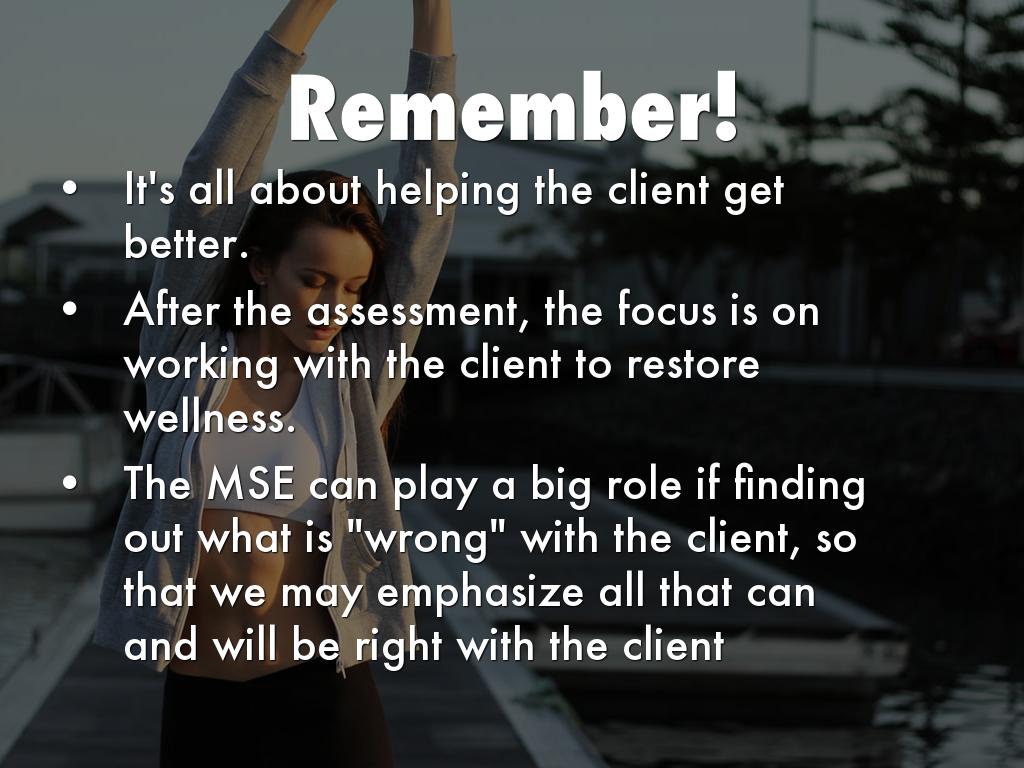 The MSE can play a big role if finding out what is "wrong" with the client, so that we may emphasize all that can and will be right with the client