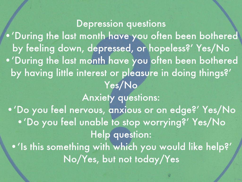 The questions for Anxiety come from a questionnaire called GAD-2 follow up might be