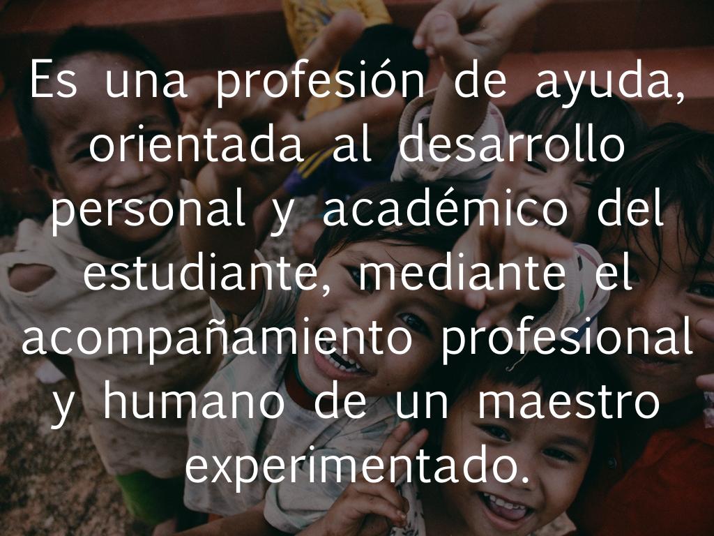 Es una profesión de ayuda, orientada al desarrollo personal y académico del estudiante, mediante el acompañamiento profesional y humano de un maestro experimentado.