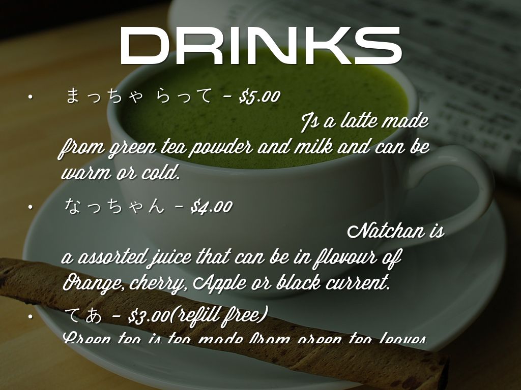 ใชใฃใกใใ - $4.00 Natchan is a assorted juice that can be in flovour of Orange, cherry, Apple or black current.