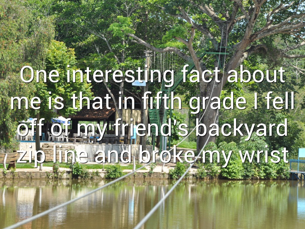 One interesting fact about me is that in fifth grade I fell off of my friend's backyard
