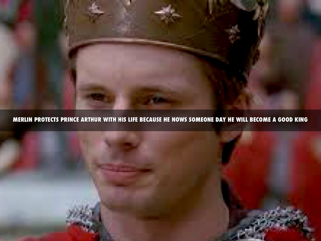 MERLIN PROTECTS PRINCE ARTHUR WITH HIS LIFE BECAUSE HE NOWS SOMEONE DAY HE WILL BECOME A GOOD KING