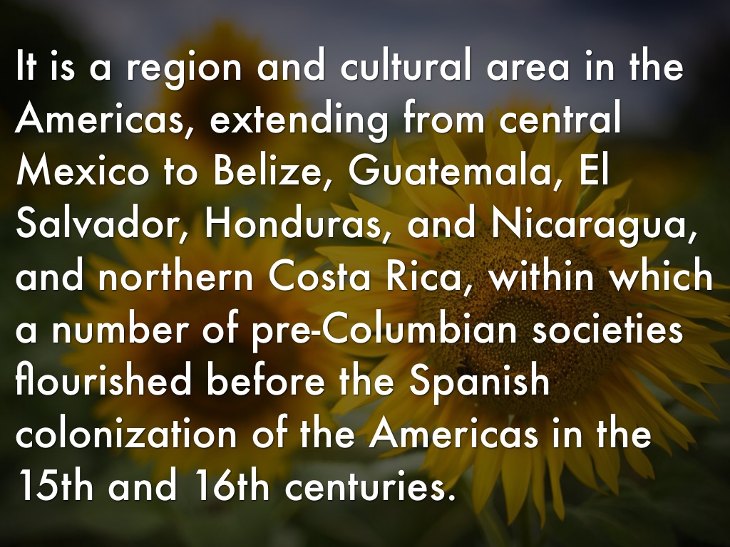It is a region and cultural area in the Americas, extending from central Mexico to Belize, Guatemala, El Salvador, Honduras, and Nicaragua, and northern Costa Rica, within which a number of pre-Columbian societies flourished before the Spanish colonization of the Americas in the 15th and 16th centuries.