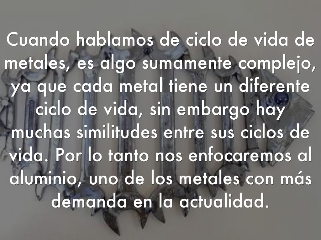 Cuando hablamos de ciclo de vida de metales, es algo sumamente complejo, ya que cada metal tiene un diferente ciclo de vida, sin embargo hay muchas similitudes entre sus ciclos de vida. Por lo tanto nos enfocaremos al aluminio, uno de los metales con más demanda en la actualidad.
