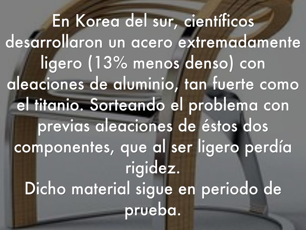 En Korea del sur, científicos desarrollaron un acero extremadamente ligero (13% menos denso) con aleaciones de aluminio, tan fuerte como el titanio. Sorteando el problema con previas aleaciones de éstos dos componentes, que al ser ligero perdía rigidez.
