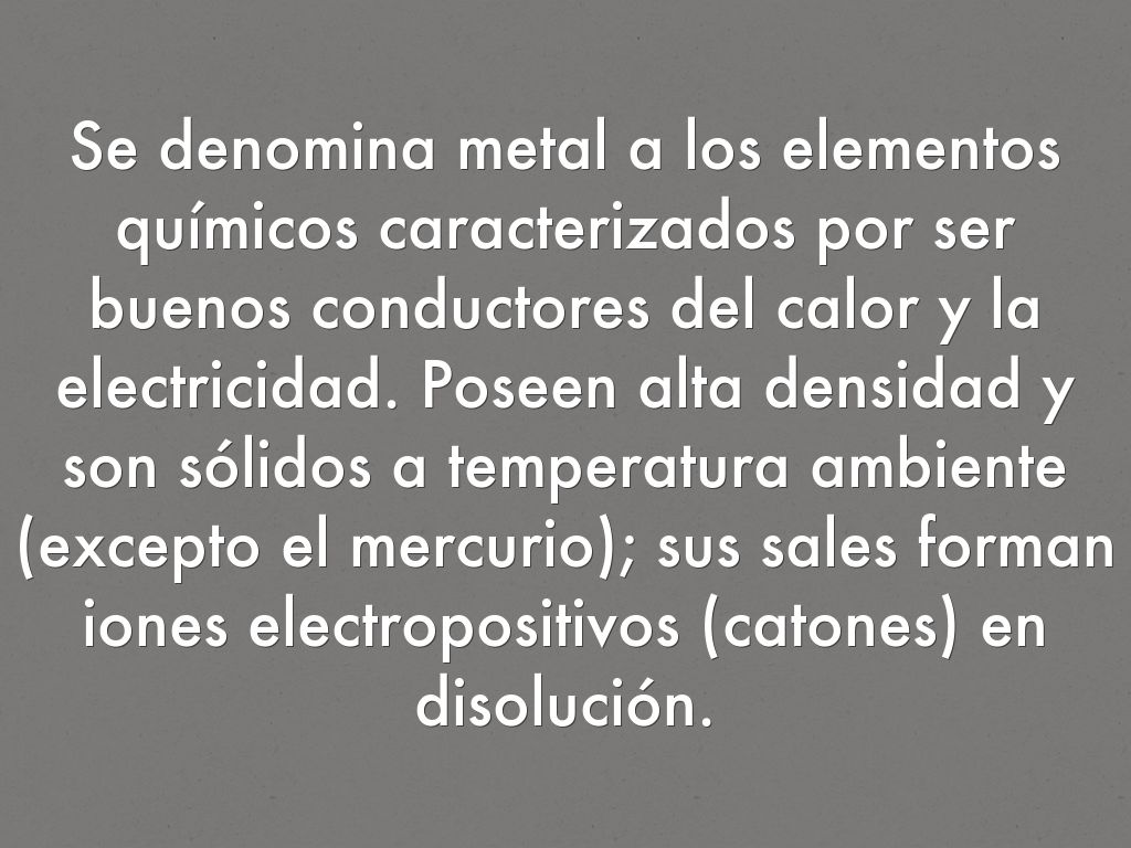 Se denomina metal a los elementos químicos caracterizados por ser buenos conductores del calor y la electricidad. Poseen alta densidad y son sólidos a temperatura ambiente (excepto el mercurio); sus sales forman iones electropositivos (catones) en disolución.