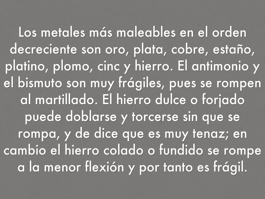 Los metales más maleables en el orden decreciente son oro, plata, cobre, estaño, platino, plomo, cinc y hierro. El antimonio y el bismuto son muy frágiles, pues se rompen al martillado. El hierro dulce o forjado puede doblarse y torcerse sin que se rompa, y de dice que es muy tenaz; en cambio el hierro colado o fundido se rompe a la menor flexión y por tanto es frágil.