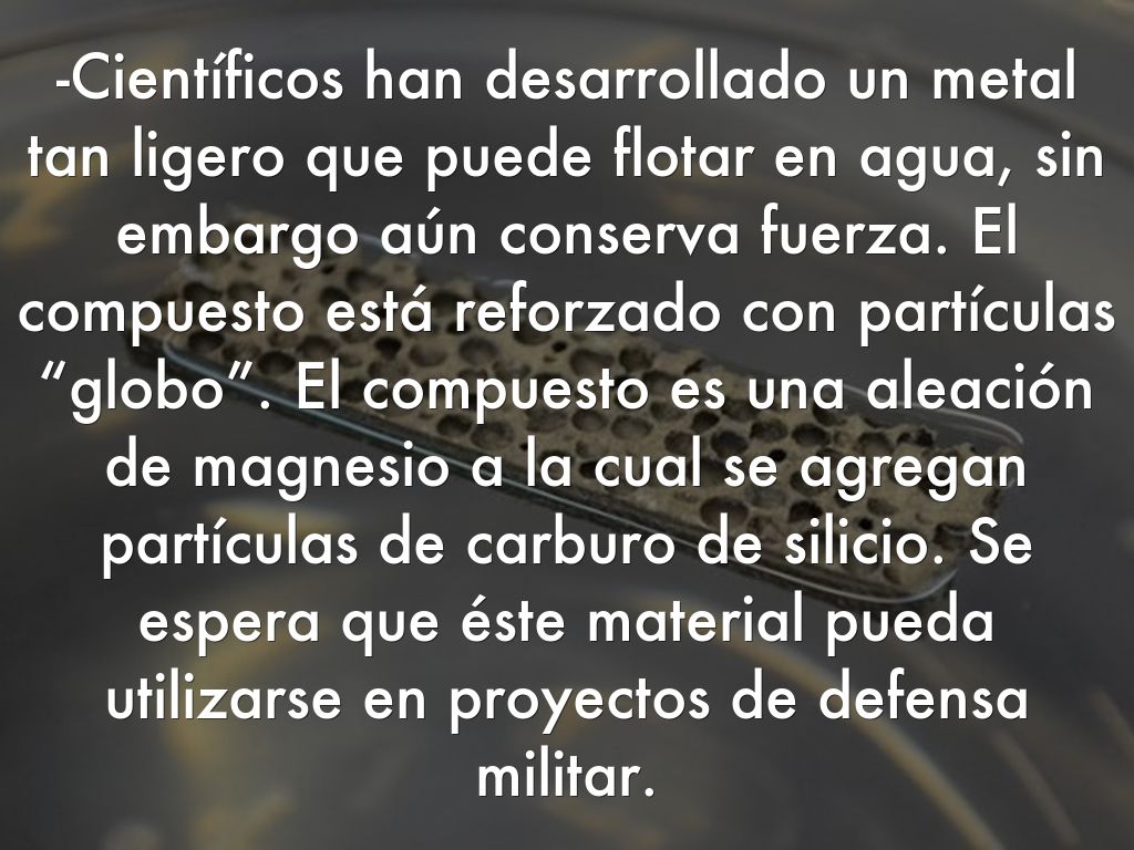 -Científicos han desarrollado un metal tan ligero que puede flotar en agua, sin embargo aún conserva fuerza. El compuesto está reforzado con partículas “globo”. El compuesto es una aleación de magnesio a la cual se agregan partículas de carburo de silicio. Se espera que éste material pueda utilizarse en proyectos de defensa militar.