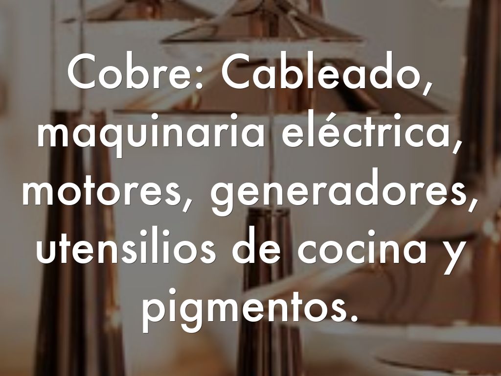 Cobre: Cableado, maquinaria eléctrica, motores, generadores, utensilios de cocina y pigmentos.