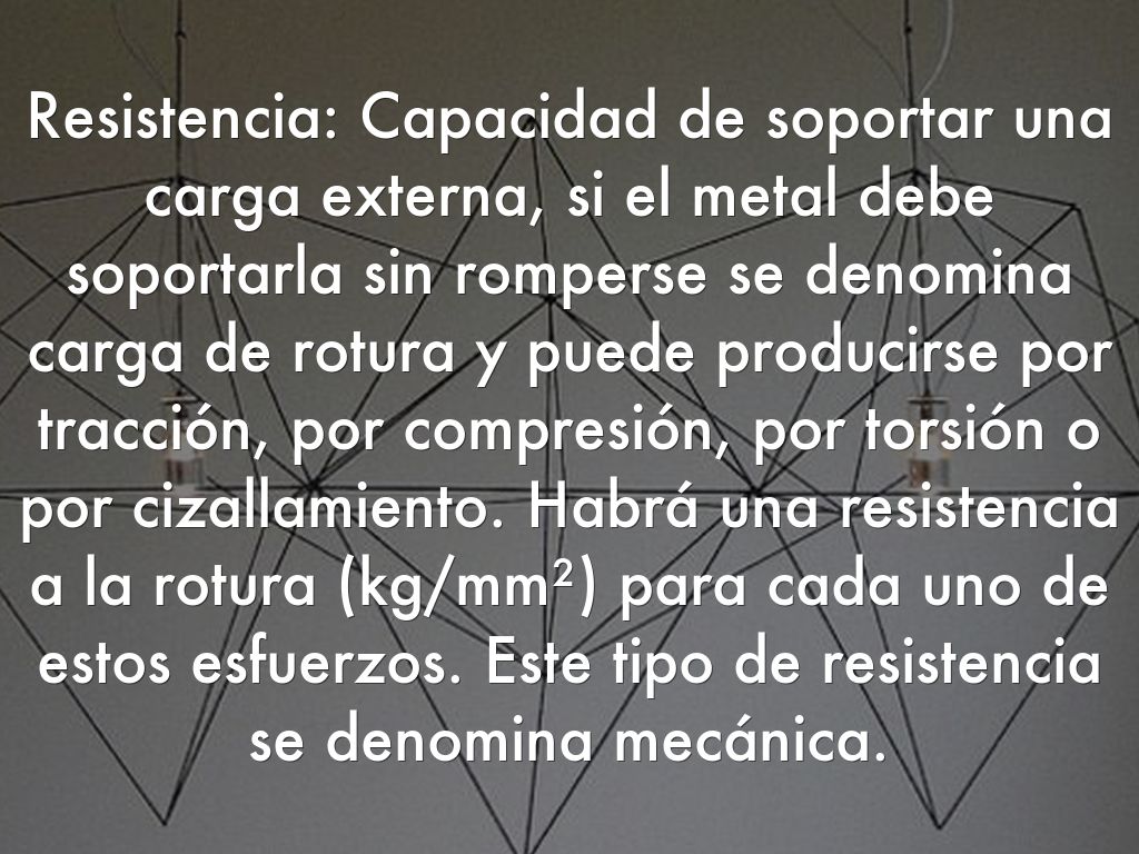 Resistencia: Capacidad de soportar una carga externa, si el metal debe soportarla sin romperse se denomina carga de rotura y puede producirse por tracción, por compresión, por torsión o por cizallamiento. Habrá una resistencia a la rotura (kg/mm²) para cada uno de estos esfuerzos. Este tipo de resistencia se denomina mecánica.