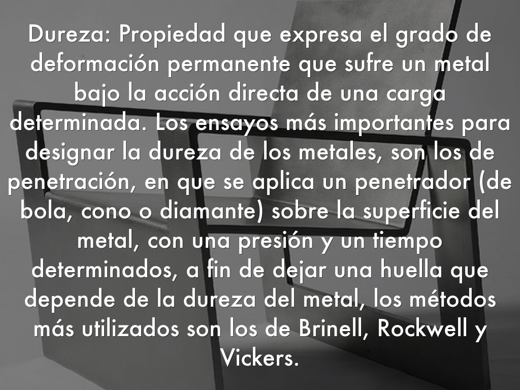 Dureza: Propiedad que expresa el grado de deformación permanente que sufre un metal bajo la acción directa de una carga determinada. Los ensayos más importantes para designar la dureza de los metales, son los de penetración, en que se aplica un penetrador (de bola, cono o diamante) sobre la superficie del metal, con una presión y un tiempo determinados, a fin de dejar una huella que depende de la dureza del metal, los métodos más utilizados son los de Brinell, Rockwell y Vickers.