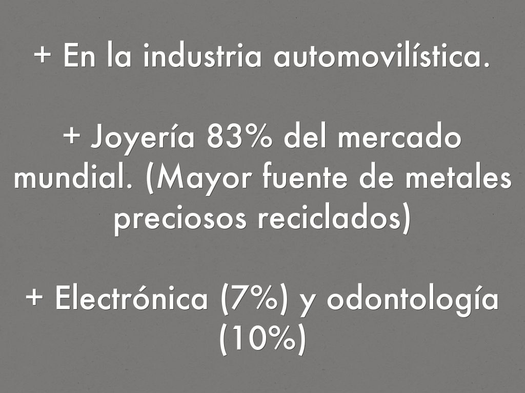 + Joyería 83% del mercado mundial. (Mayor fuente de metales preciosos reciclados)