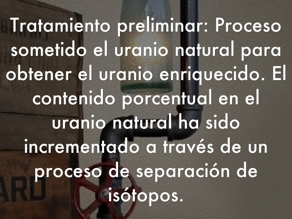 Tratamiento preliminar: Proceso sometido el uranio natural para obtener el uranio enriquecido. El contenido porcentual en el uranio natural ha sido incrementado a través de un proceso de separación de isótopos.