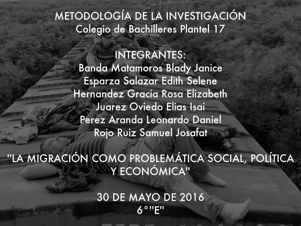 METODOLOGÍA DE LA INVESTIGACIÓN Colegio de Bachilleres Plantel 17 INTEGRANTES: Banda Matamoros Blady Janice Perez Aranda Leonardo Daniel Juarez Oviedo Elias Isai Rojo Ruiz Samuel Josafat Esparza Salazar Edith Selene Hernandez Garcia Rosa Elizabeth ''MIGRACIÓN'' 30 DE MAYO DE 2016