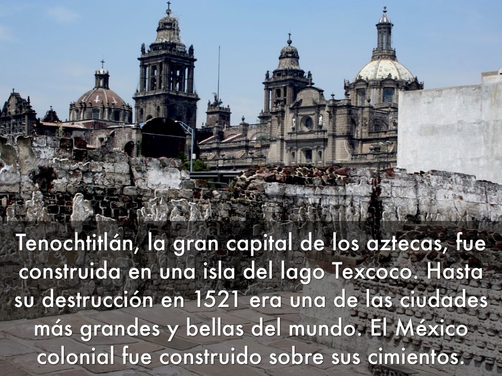 Tenochtitlán, la gran capital de los aztecas, fue construida en una isla del lago Texcoco. Hasta su destrucción en 1521 era una de las ciudades más grandes y bellas del mundo. El México colonial fue construido sobre sus cimientos.