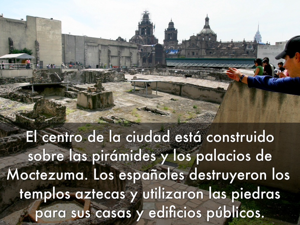 El centro de la ciudad está construido sobre las pirámides y los palacios de Moctezuma. Los españoles destruyeron los templos aztecas y utilizaron las piedras para sus casas y edificios públicos.