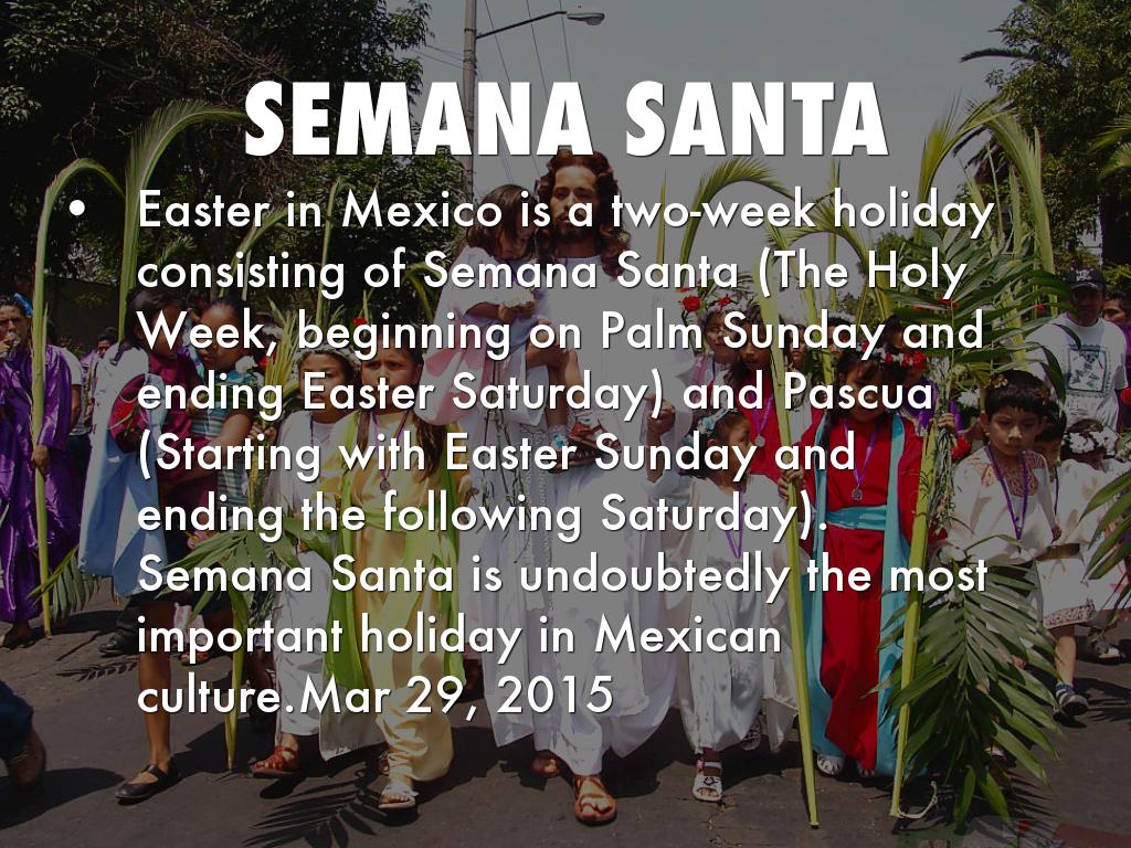 Easter in Mexico is a two-week holiday consisting of Semana Santa (The Holy Week, beginning on Palm Sunday and ending Easter Saturday) and Pascua (Starting with Easter Sunday and ending the following Saturday). Semana Santa is undoubtedly the most important holiday in Mexican culture.Mar 29, 2015