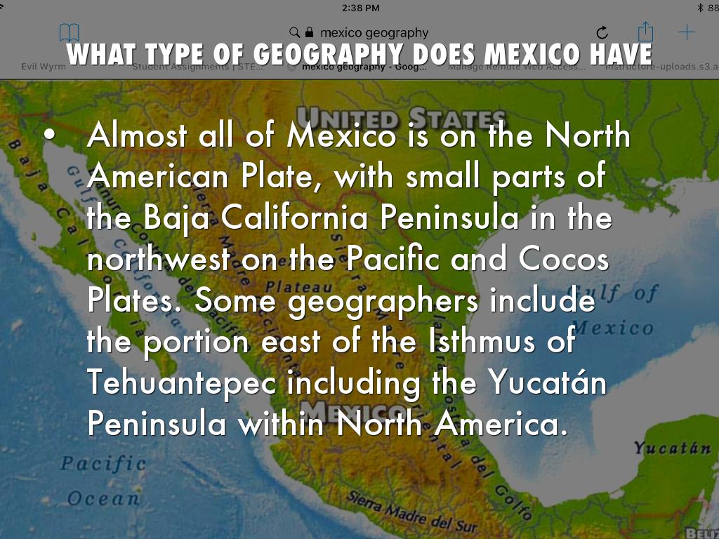 Almost all of Mexico is on the North American Plate, with small parts of the Baja California Peninsula in the northwest on the Pacific and Cocos Plates. Some geographers include the portion east of the Isthmus of Tehuantepec including the Yucatán Peninsula within North America.