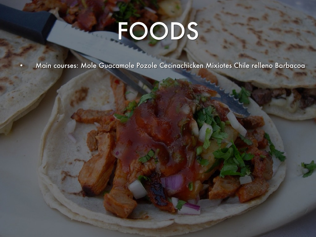 Main courses: Mole Guacamole Pozole Cecinachicken Mixiotes Chile relleno Barbacoa