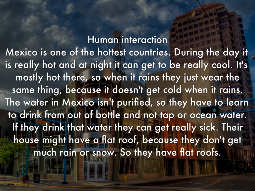 Human interaction Mexico is one of the hottest countries. During the day it is really hot and at night it can get to be really cool. It's mostly hot there, so when it rains they just wear the same thing, because it doesn't get cold when it rains. The water in Mexico isn't purified, so they have to learn to drink from out of bottle and not tap or ocean water. If they drink that water they can get really sick. Their house might have a flat roof, because they don't get much rain or snow. So they have flat roofs.