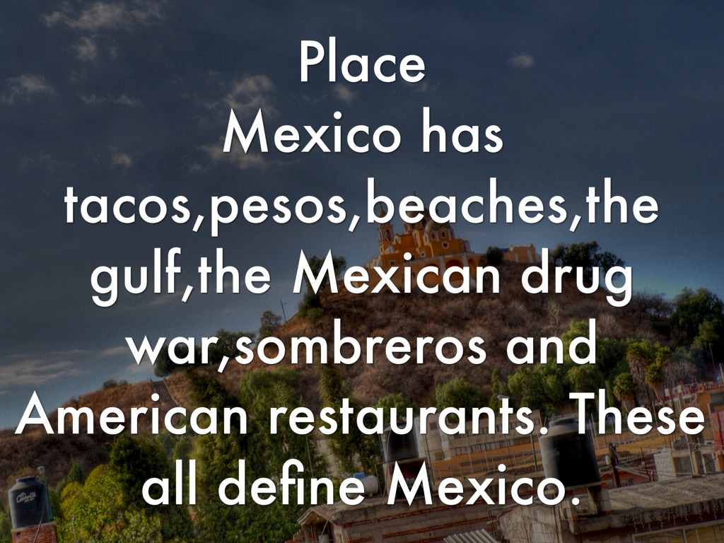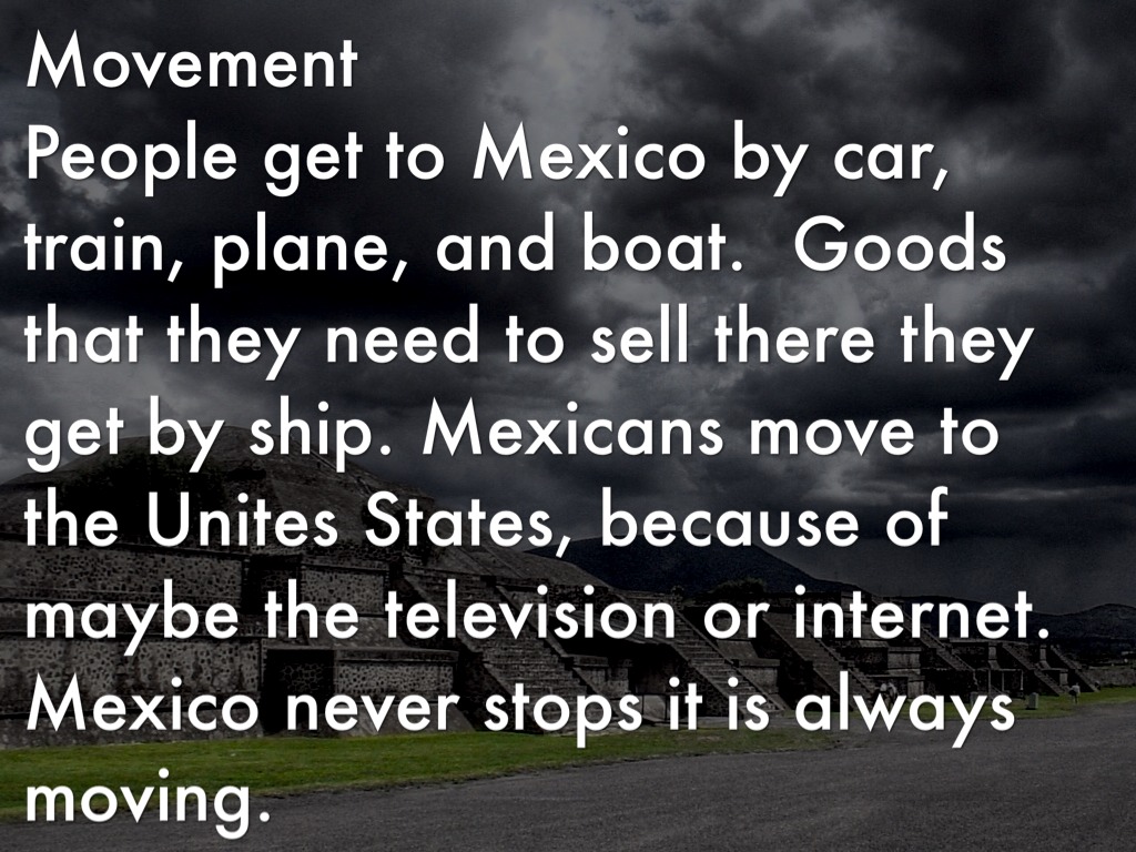 Movement People get to Mexico by car, train, plane, and boat. Goods that they need to sell there they get by ship. Mexicans move to the Unites States, because of maybe the television or internet. Mexico never stops it is always moving.