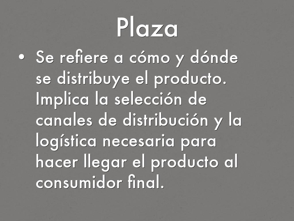 • Se refiere a cómo y dónde se distribuye el producto. Implica la selección de canales de distribución y la logística necesaria para hacer llegar el producto al consumidor final.