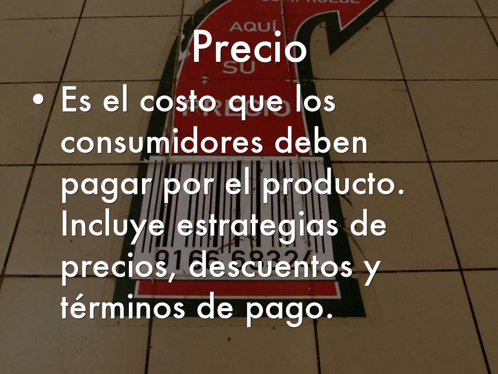 • Es el costo que los consumidores deben pagar por el producto. Incluye estrategias de precios, descuentos y términos de pago.