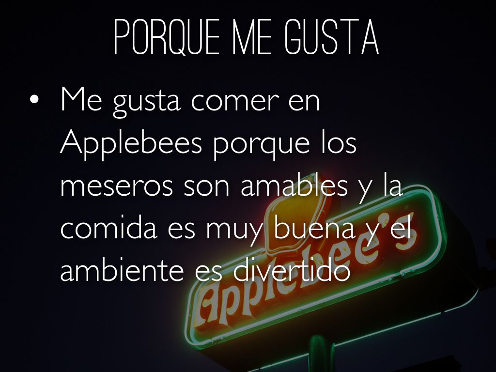 Me gusta comer en Applebees porque los meseros son amables y la comida es muy buena y el ambiente es divertido
