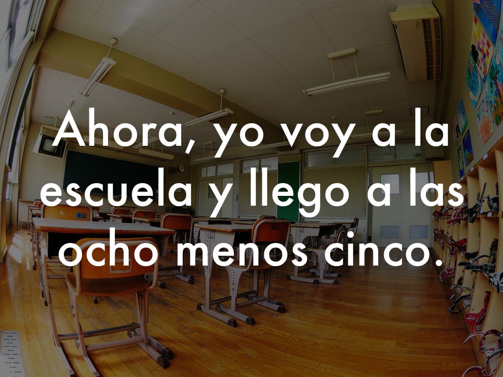 Ahora, yo voy a la escuela y llego a las ocho menos cinco.