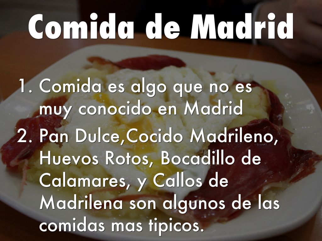 Pan Dulce,Cocido Madrileno, Huevos Rotos, Bocadillo de Calamares, y Callos de Madrilena son algunos de las comidas mas tipicos.