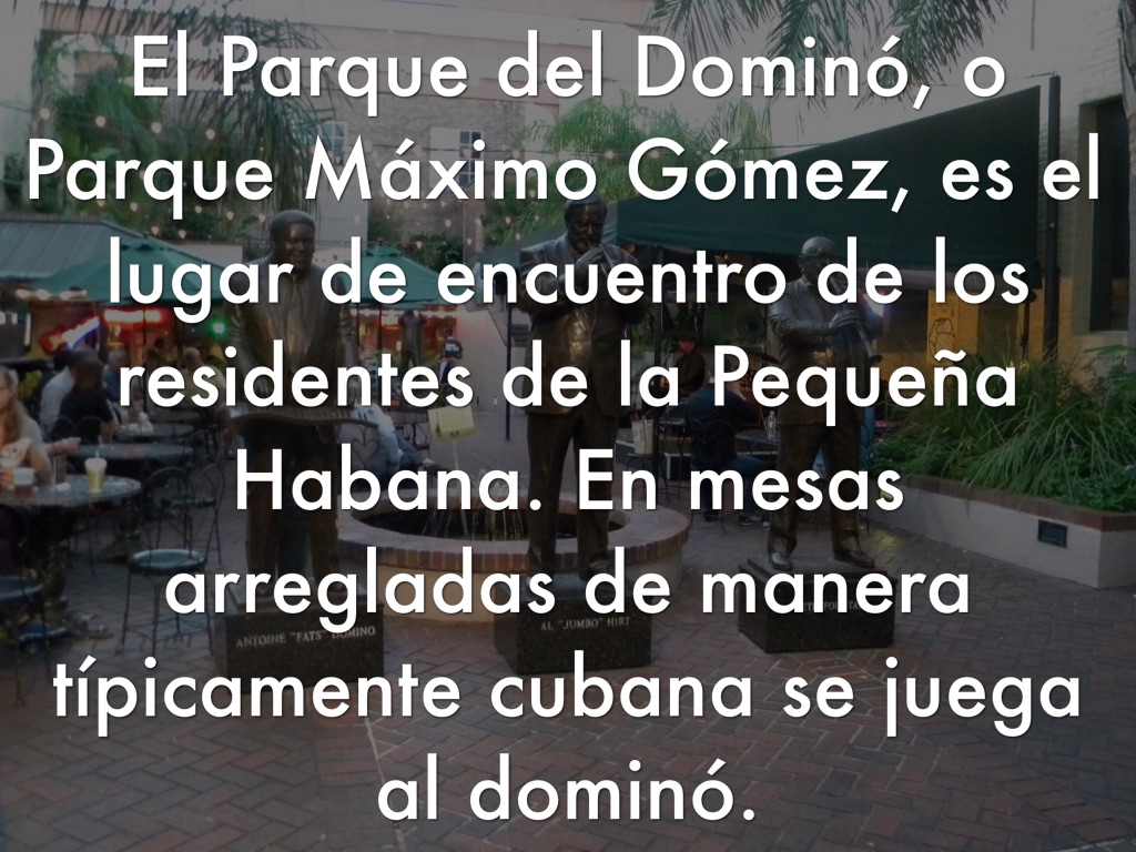 El Parque del Dominó, o Parque Máximo Gómez, es el lugar de encuentro de los residentes de la Pequeña Habana. En mesas arregladas de manera típicamente cubana se juega al dominó.