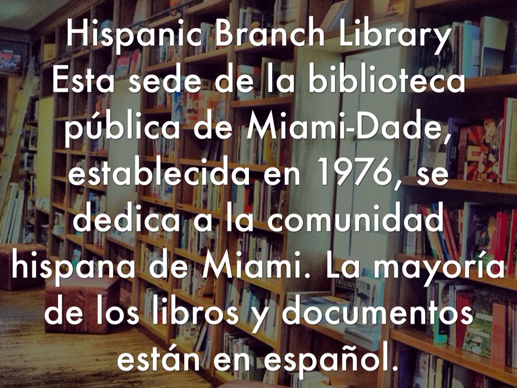 Hispanic Branch Library Esta sede de la biblioteca pública de Miami-Dade, establecida en 1976, se dedica a la comunidad hispana de Miami. La mayoría de los libros y documentos están en español.