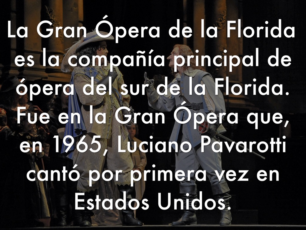 La Gran Ópera de la Florida es la compañía principal de ópera del sur de la Florida. Fue en la Gran Ópera que, en 1965, Luciano Pavarotti cantó por primera vez en Estados Unidos.