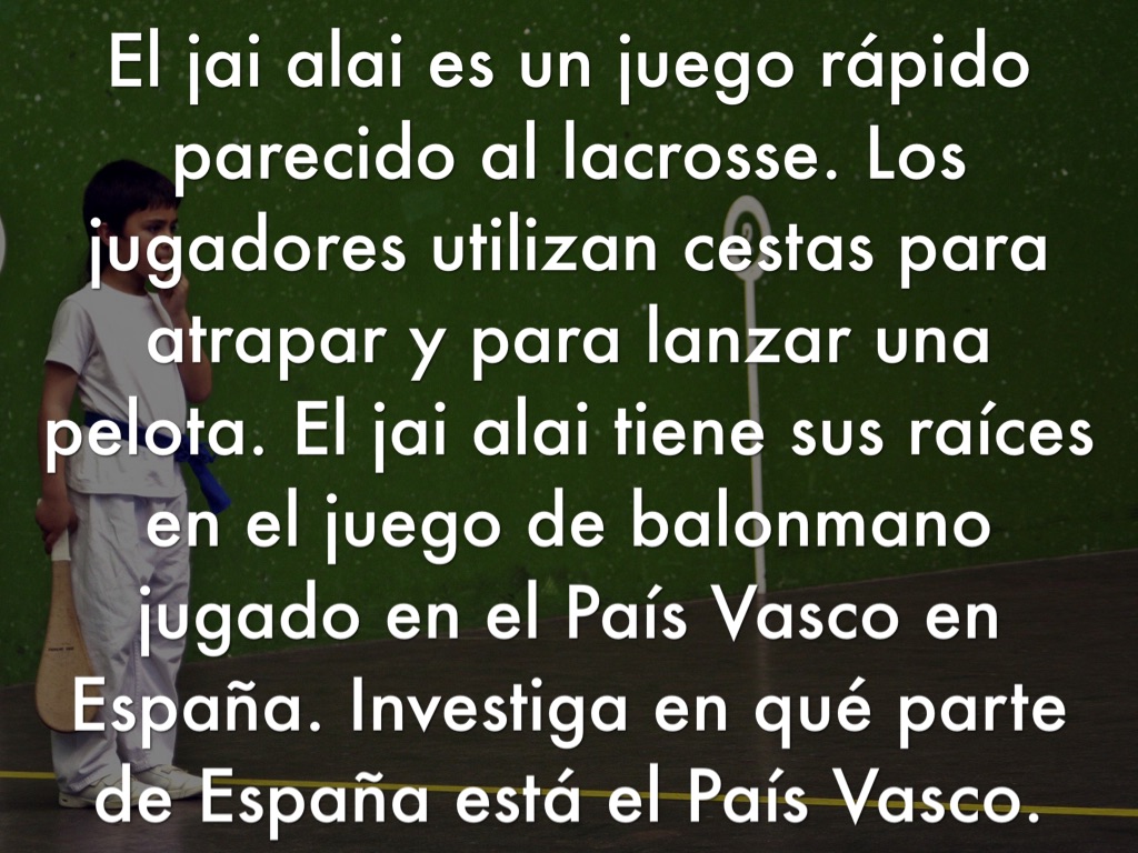 El jai alai es un juego rápido parecido al lacrosse. Los jugadores utilizan cestas para atrapar y para lanzar una pelota. El jai alai tiene sus raíces en el juego de balonmano jugado en el País Vasco en España. Investiga en qué parte de España está el País Vasco.