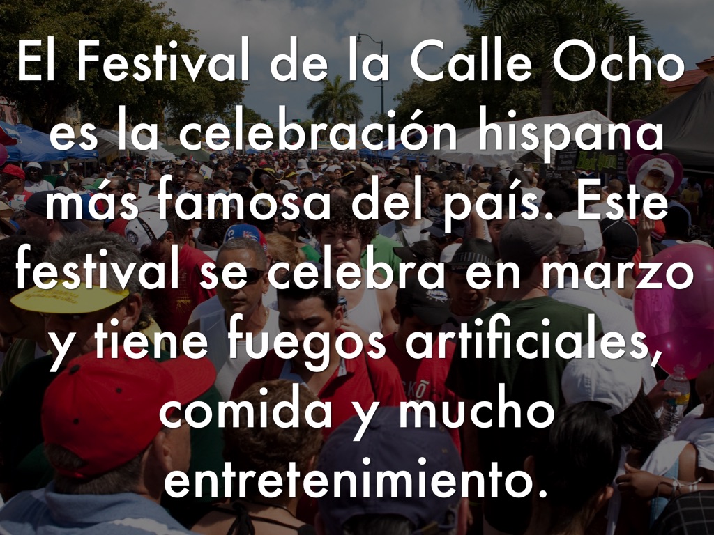 El Festival de la Calle Ocho es la celebración hispana más famosa del país. Este festival se celebra en marzo y tiene fuegos artificiales, comida y mucho entretenimiento.