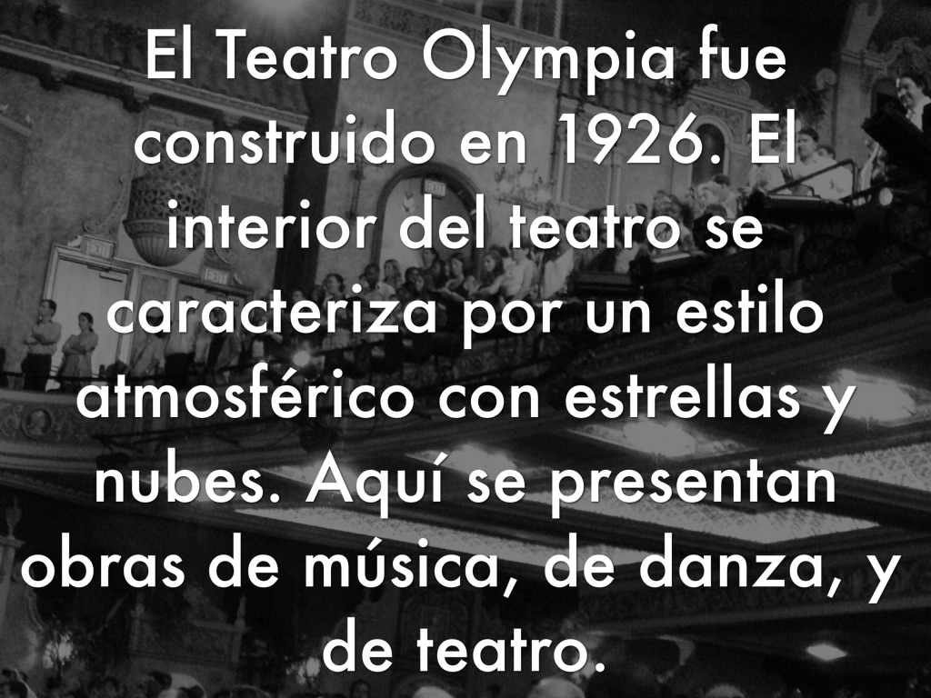 El Teatro Olympia fue construido en 1926. El interior del teatro se caracteriza por un estilo atmosférico con estrellas y nubes. Aquí se presentan obras de música, de danza, y de teatro.