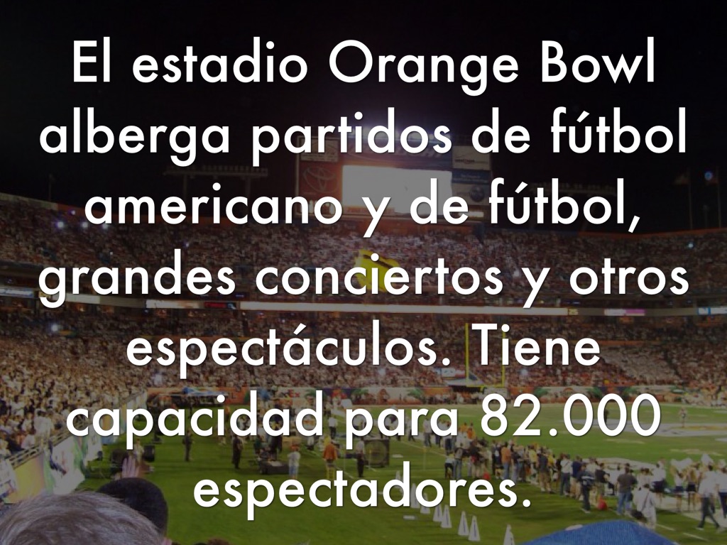 El estadio Orange Bowl alberga partidos de fútbol americano y de fútbol, grandes conciertos y otros espectáculos. Tiene capacidad para 82.000 espectadores.