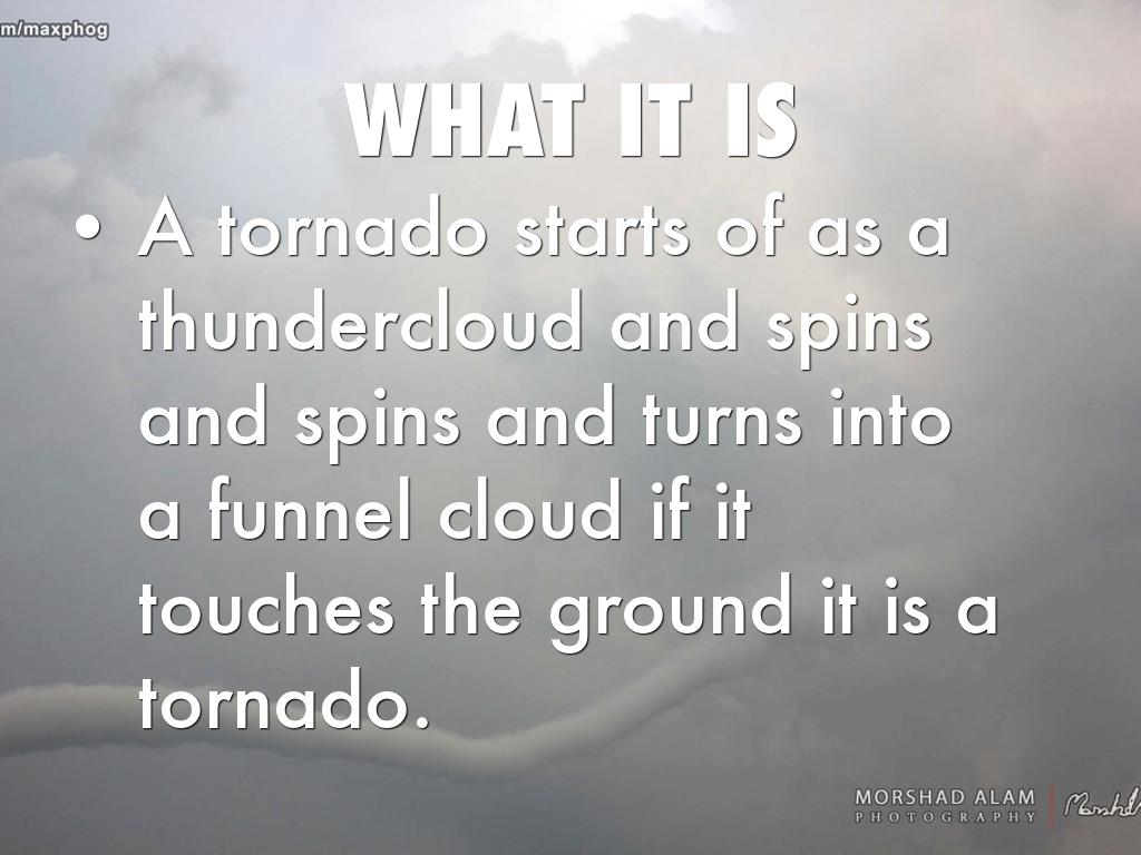 A tornado starts of as a thundercloud and spins and spins and turns into a funnel cloud if it touches the ground it is a tornado.