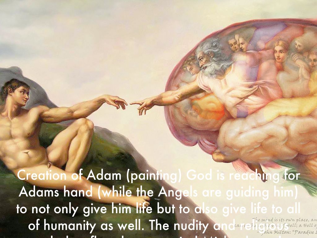 Creation of Adam (painting) God is reaching for Adams hand (while the Angels are guiding him) to not only give him life but to also give life to all of humanity as well. The nudity and religious symbols reflect the art period Michaelangelo belonged to.