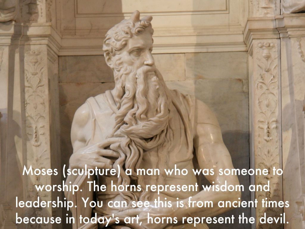 Moses (sculpture) a man who was someone to worship. The horns represent wisdom and leadership. You can see this is from ancient times because in today's art, horns represent the devil.