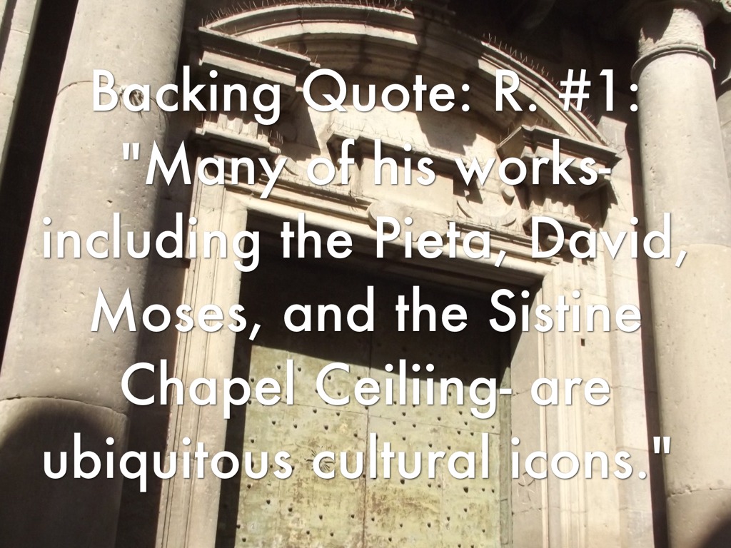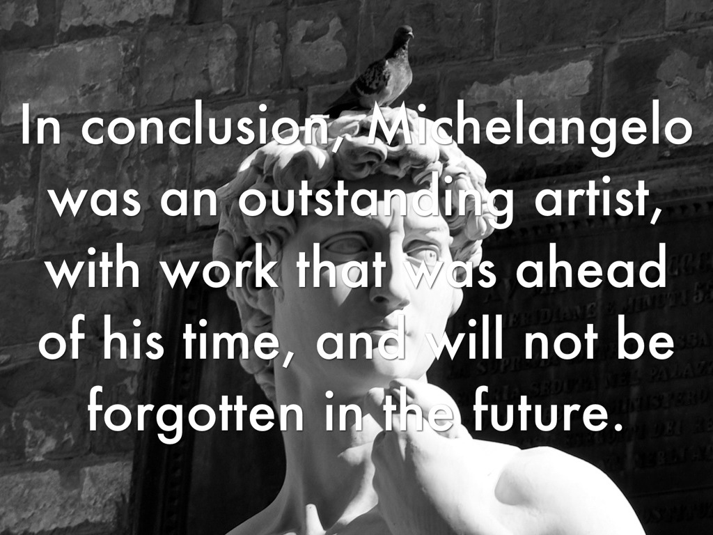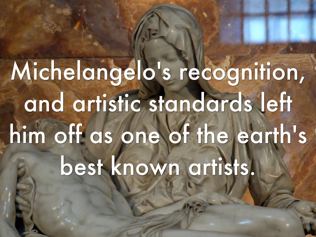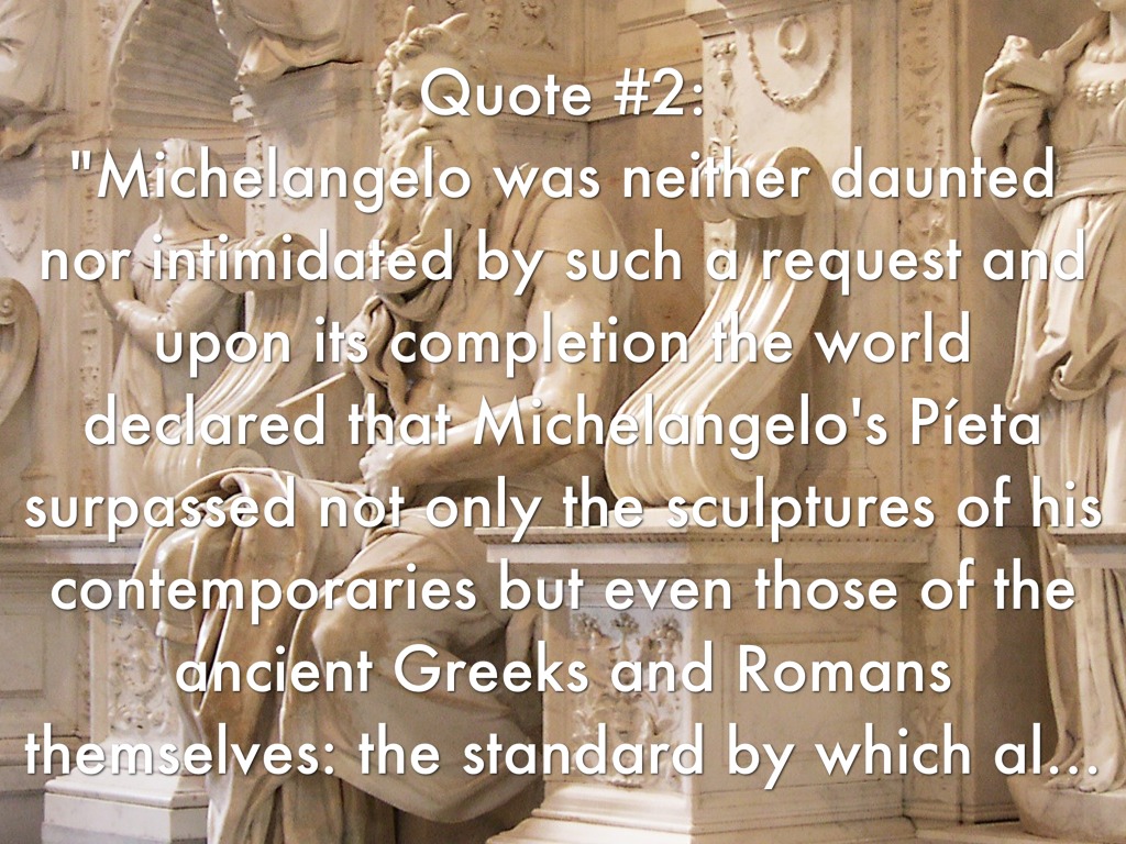 "Michelangelo was neither daunted nor intimidated by such a request and upon its completion the world declared that Michelangelo's Píeta surpassed not only the sculptures of his contemporaries but even those of the ancient Greeks and Romans themselves: the standard by which all art was judged."