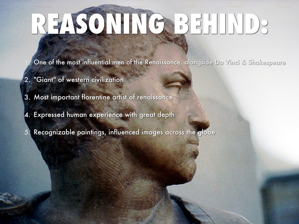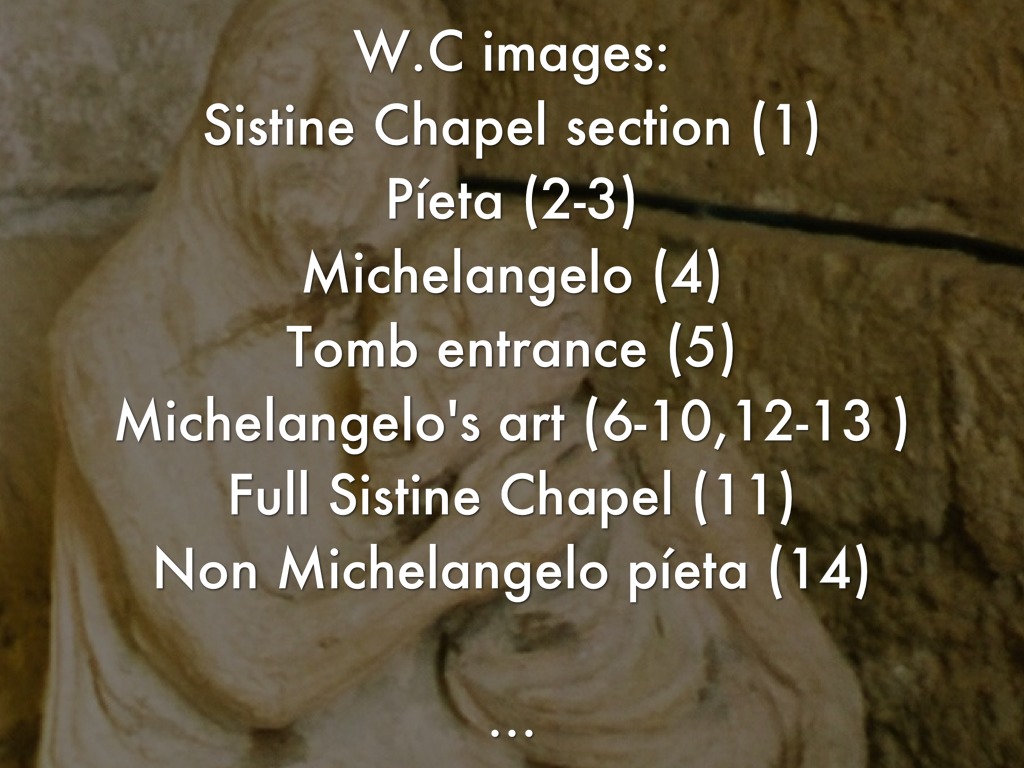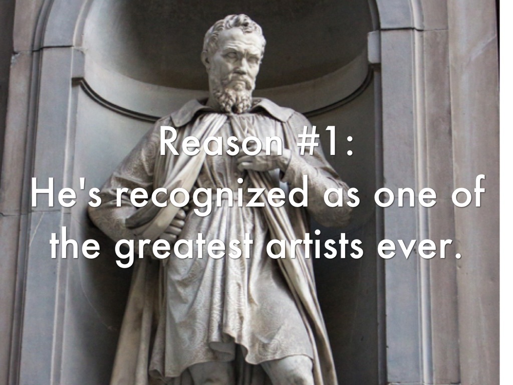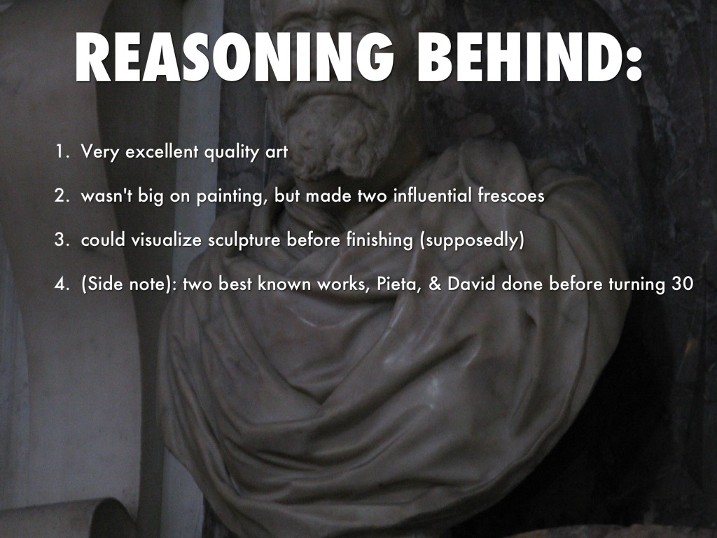 "Michelangelo was neither daunted nor intimidated by such a request and upon its completion the world declared that Michelangelo's Píeta surpassed not only the sculptures of his contemporaries but even those of the ancient Greeks and Romans themselves: the standard by which all art was judged."