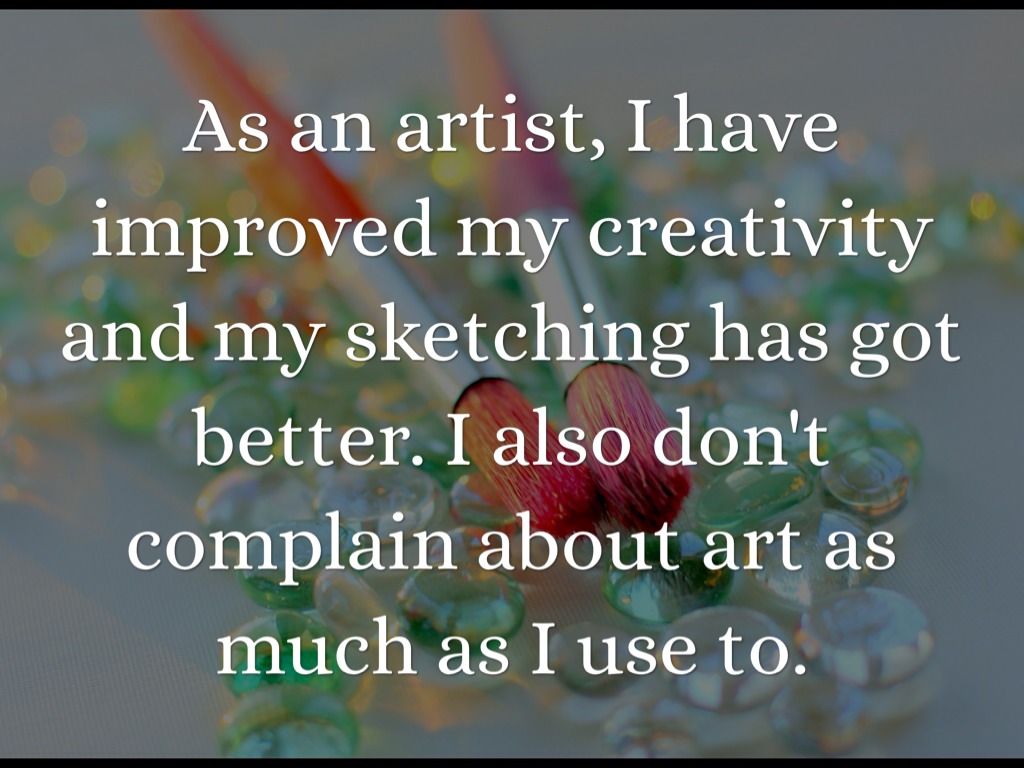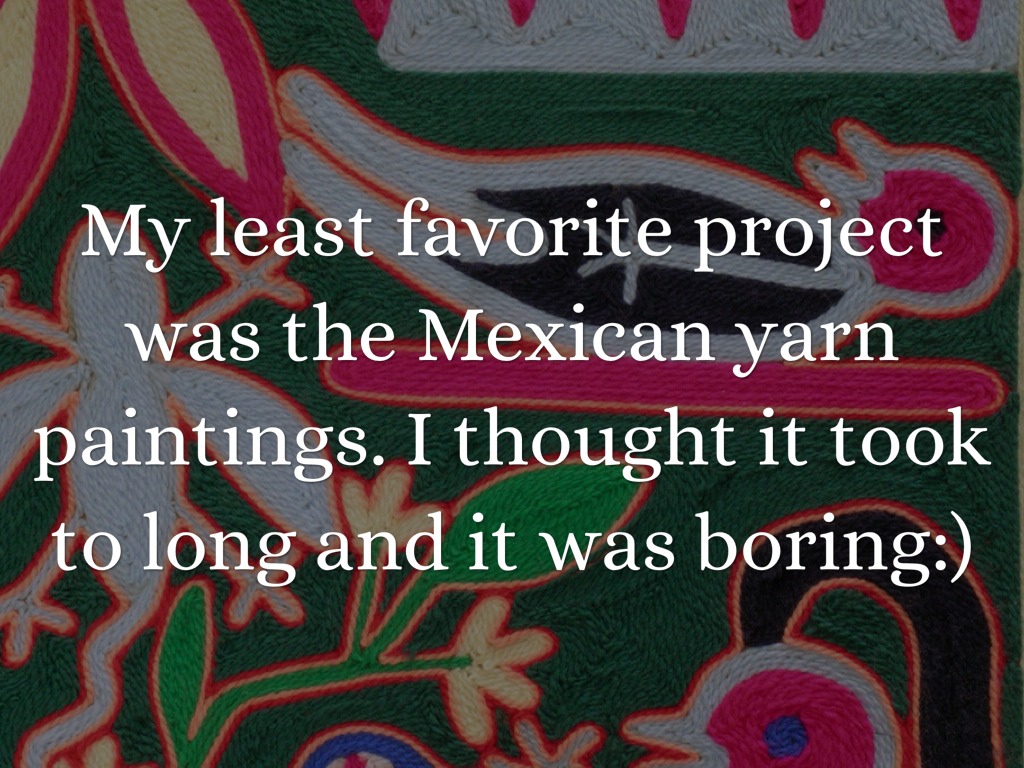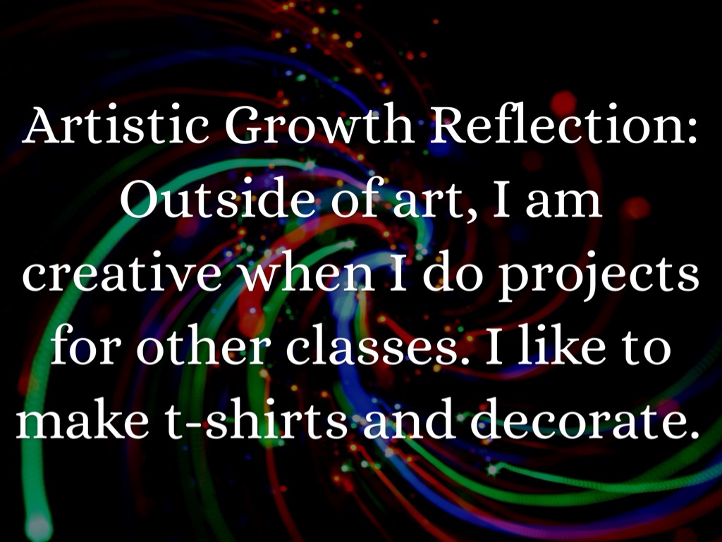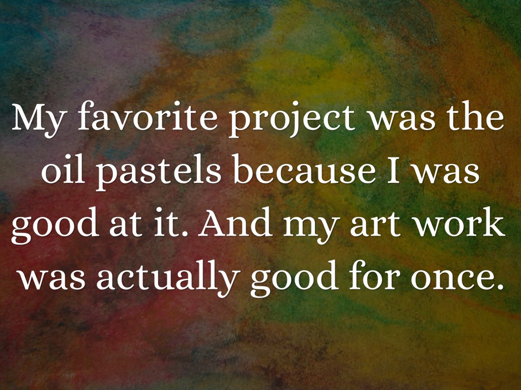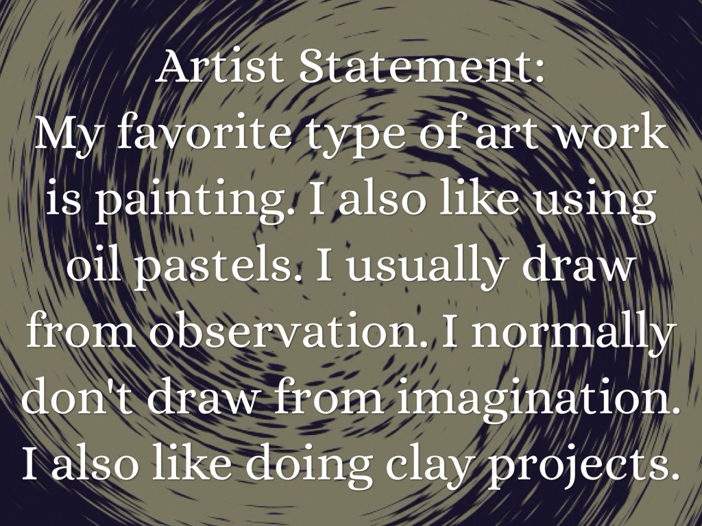 Artist Statement: My favorite type of art work is painting. I also like using oil pastels. I usually draw from observation. I normally don't draw from imagination. I also like doing clay projects.