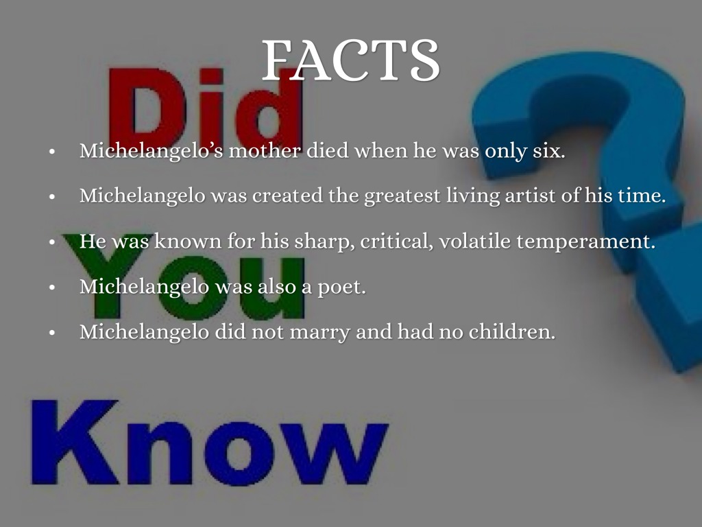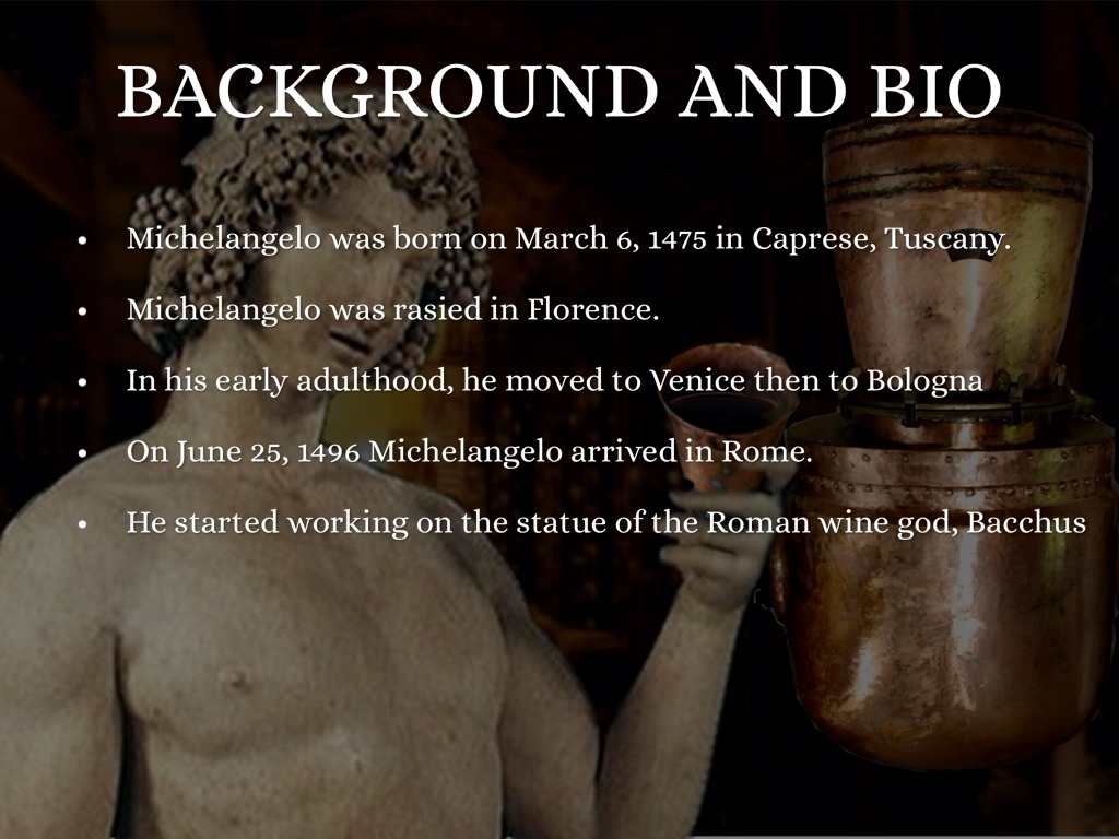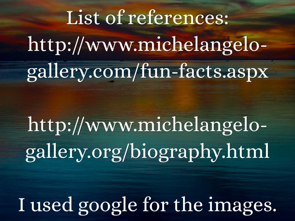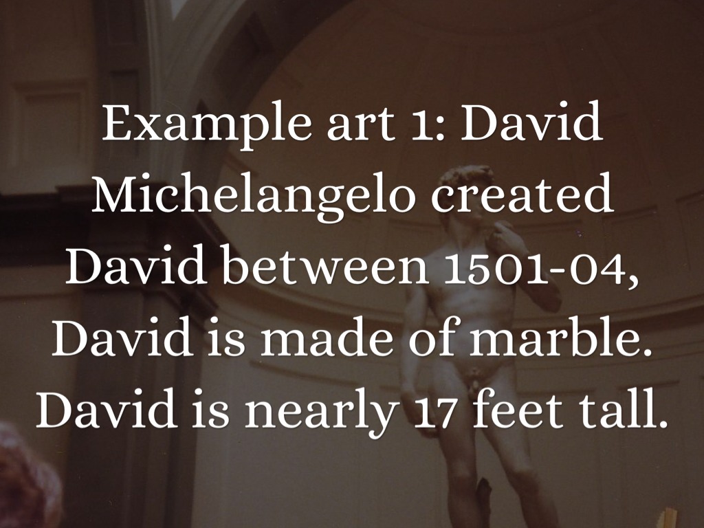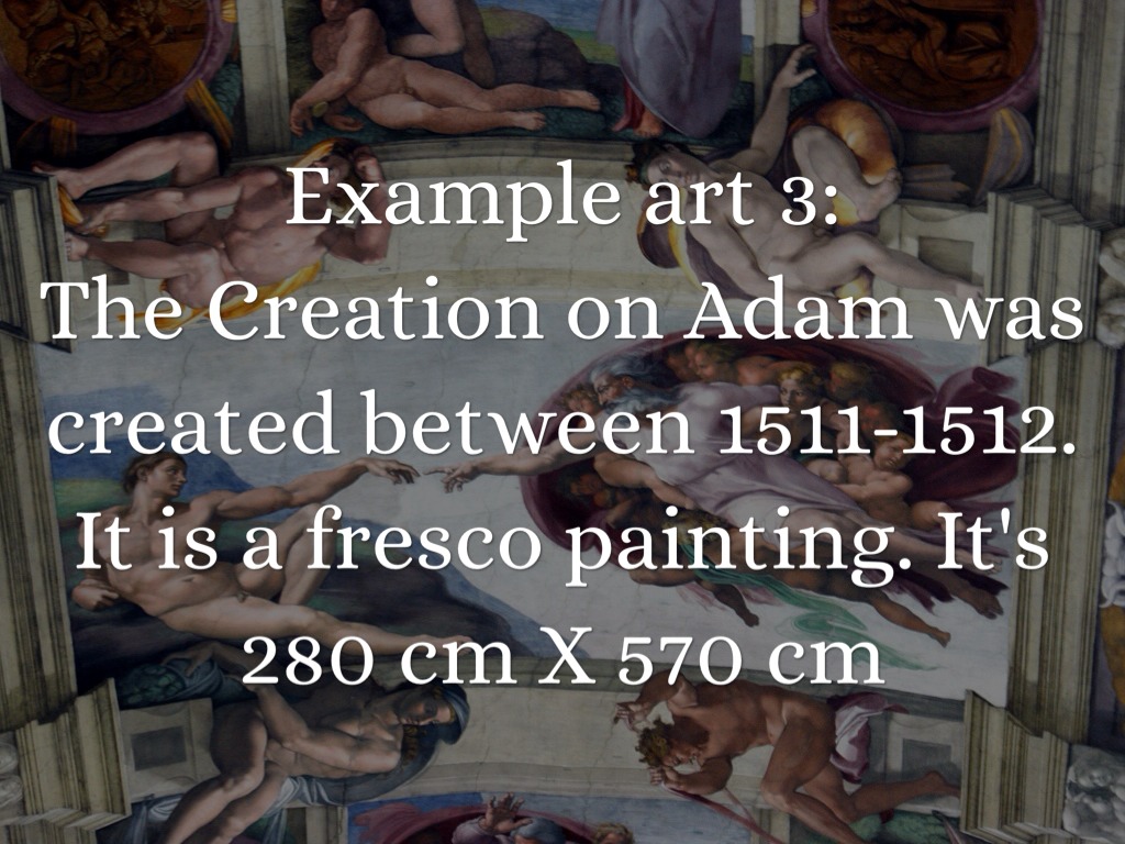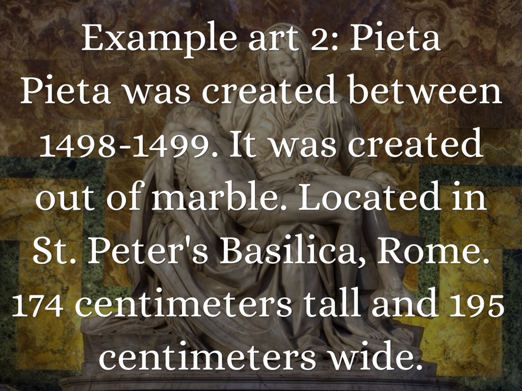 Example art 2: Pieta Pieta was created between 1498-1499. It was created out of marble. Located in St. Peter's Basilica, Rome. 174 centimeters tall and 195 centimeters wide.