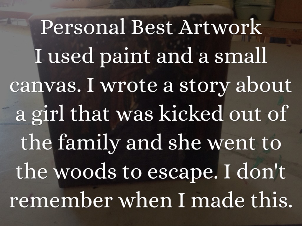 Personal Best Artwork I used paint and a small canvas. I wrote a story about a girl that was kicked out of the family and she went to the woods to escape. I don't remember when I made this.
