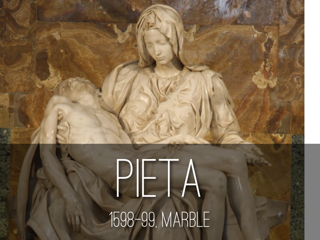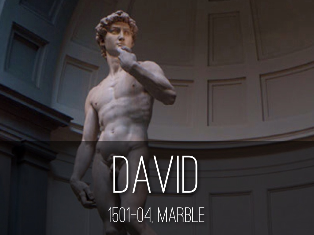 Michelangelo's David is a very idealized depiction of a teenage herd boy. One the first freestanding nudes of the Renaissance, Michelangelo used the Greek technique of contrapposto, or the natural weight-shifting stance, in this piece. It stands 17' tall and features a muscular, glorified David with a confident look on his face with his famous slingshot draped over his right shoulder.