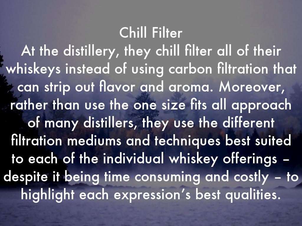 At the distillery, they chill filter all of their whiskeys instead of using carbon filtration that can strip out flavor and aroma. Moreover, rather than use the one size fits all approach of many distillers, they use the different filtration mediums and techniques best suited to each of the individual whiskey offerings – despite it being time consuming and costly – to highlight each expression’s best qualities.