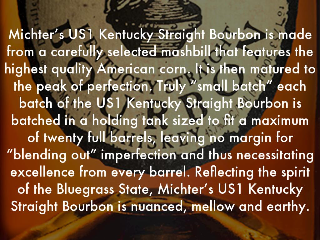 Michter’s US1 Kentucky Straight Bourbon is made from a carefully selected mashbill that features the highest quality American corn. It is then matured to the peak of perfection. Truly “small batch” each batch of the US1 Kentucky Straight Bourbon is batched in a holding tank sized to fit a maximum of twenty full barrels, leaving no margin for “blending out” imperfection and thus necessitating excellence from every barrel. Reflecting the spirit of the Bluegrass State, Michter’s US1 Kentucky Straight Bourbon is nuanced, mellow and earthy.