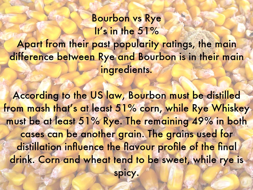 According to the US law, Bourbon must be distilled from mash that’s at least 51% corn, while Rye Whiskey must be at least 51% Rye. The remaining 49% in both cases can be another grain. The grains used for distillation influence the flavour profile of the final drink. Corn and wheat tend to be sweet, while rye is spicy.
