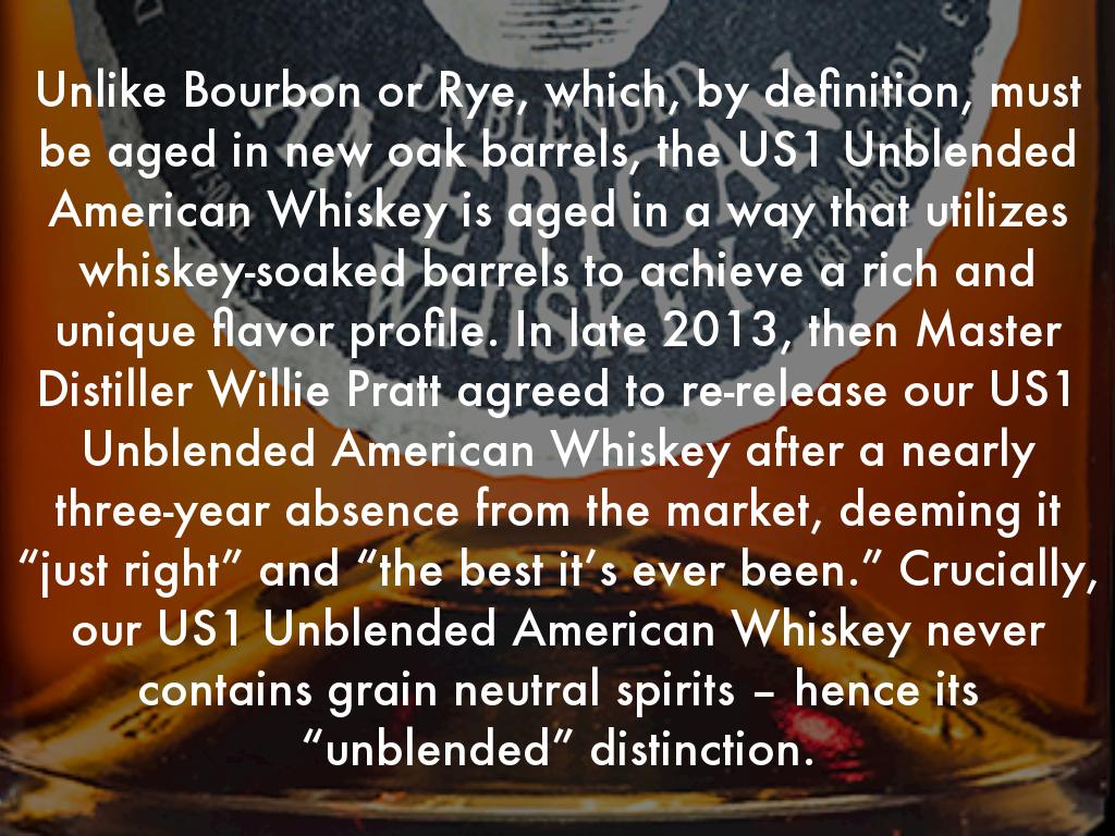 Unlike Bourbon or Rye, which, by definition, must be aged in new oak barrels, the US1 Unblended American Whiskey is aged in a way that utilizes whiskey-soaked barrels to achieve a rich and unique flavor profile. In late 2013, then Master Distiller Willie Pratt agreed to re-release our US1 Unblended American Whiskey after a nearly three-year absence from the market, deeming it “just right” and “the best it’s ever been.” Crucially, our US1 Unblended American Whiskey never contains grain neutral spirits – hence its “unblended” distinction.